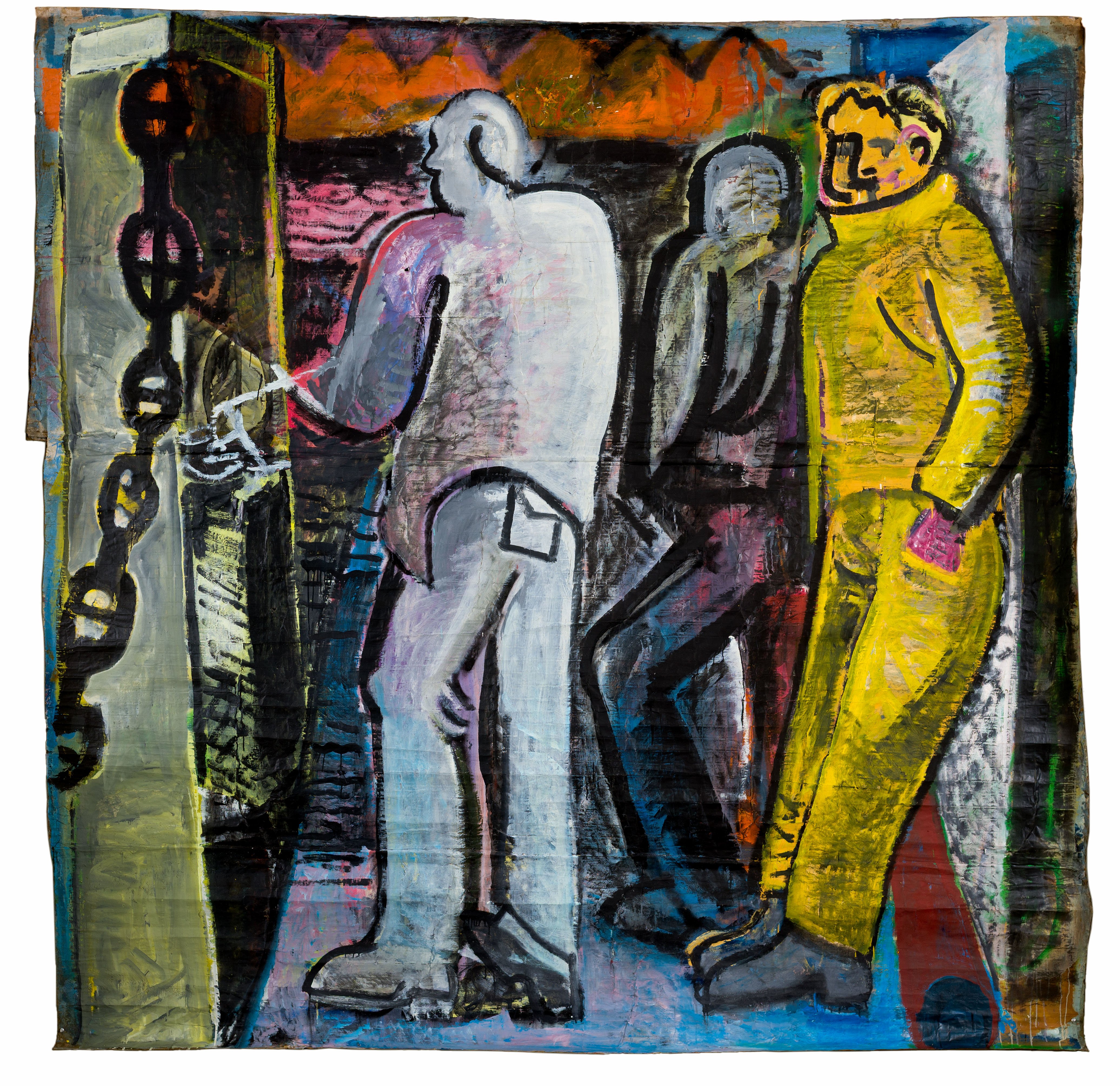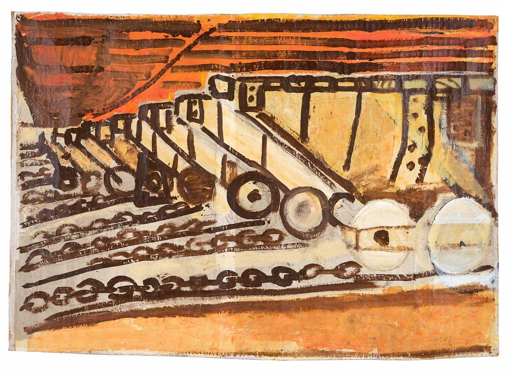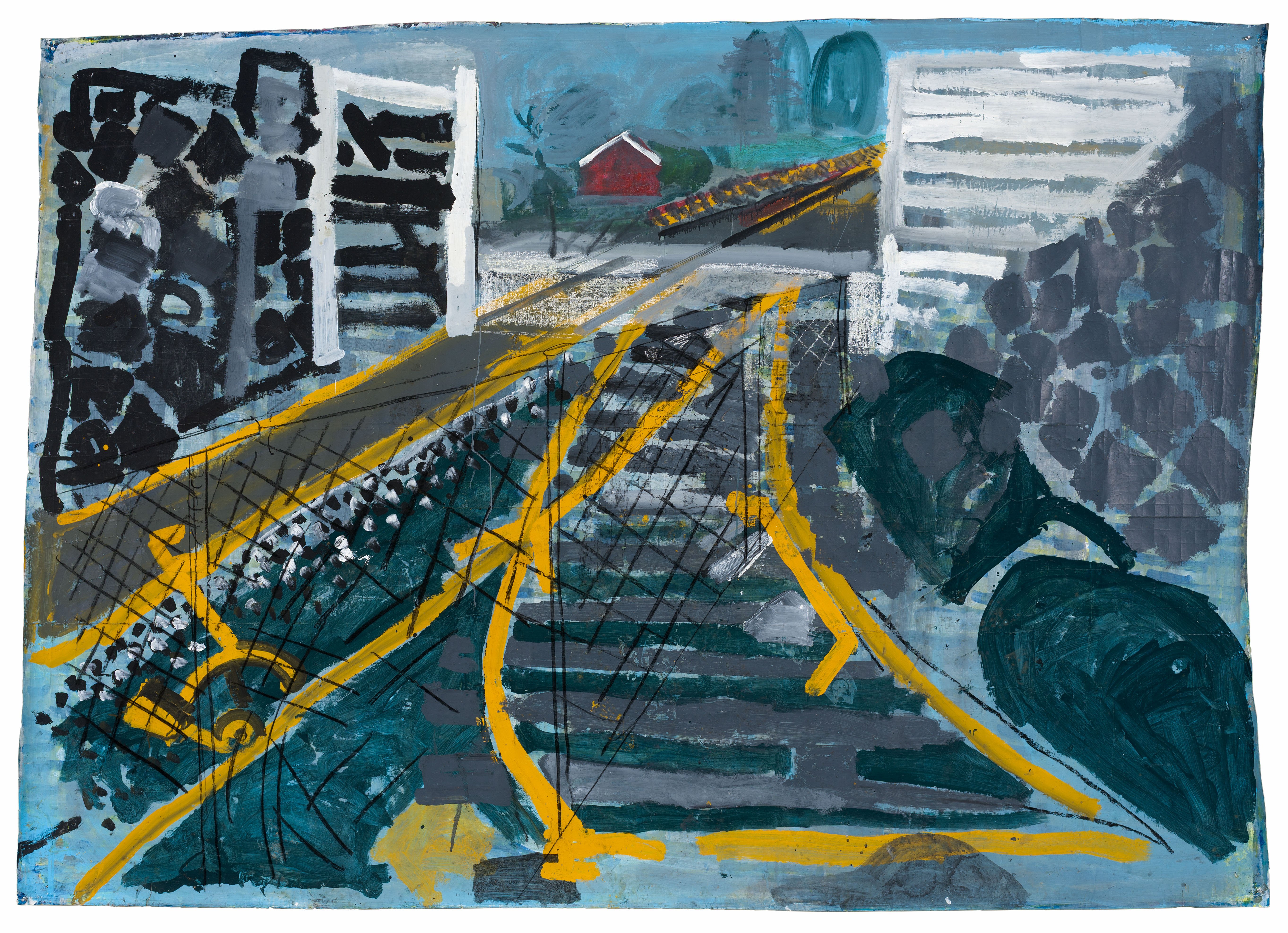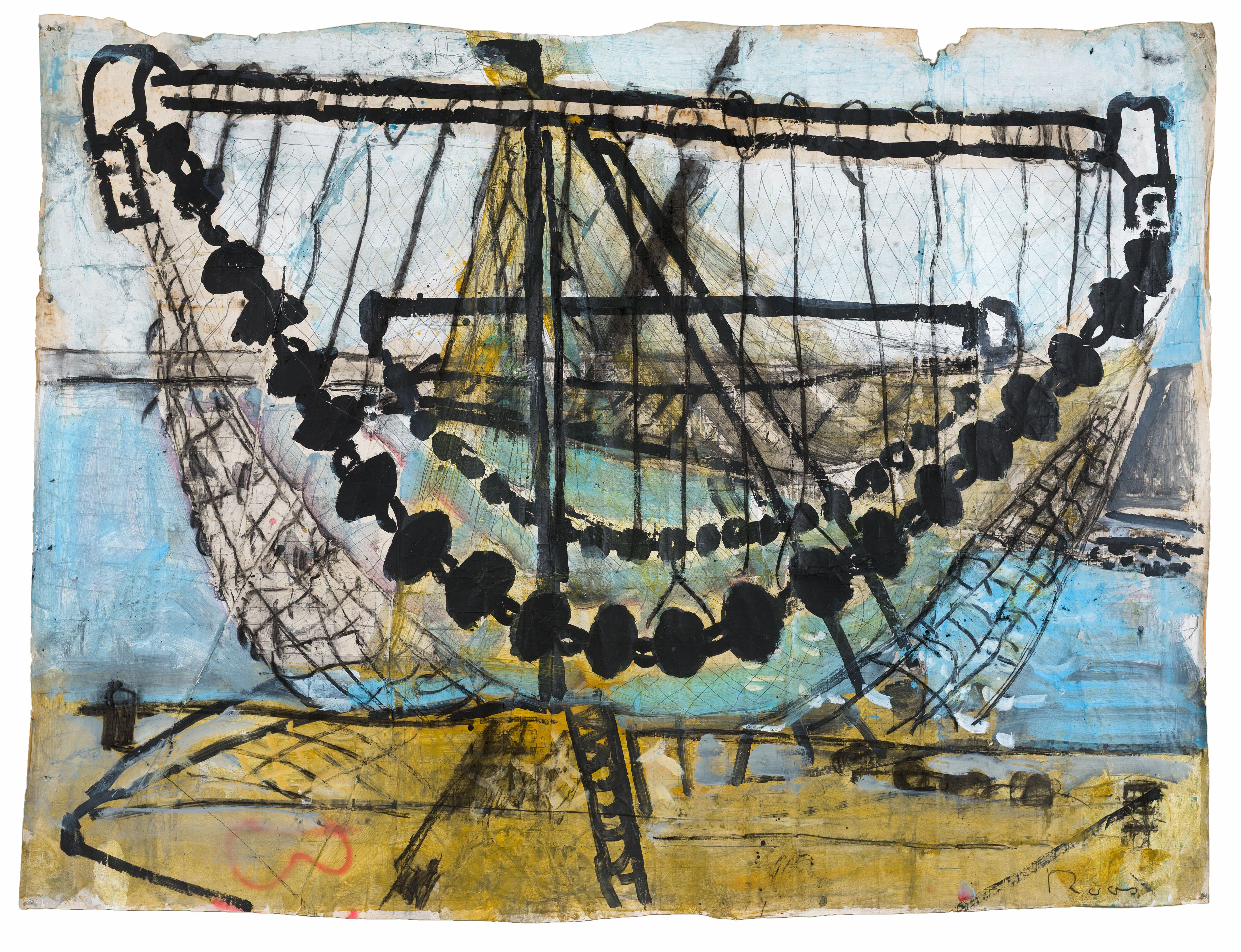 To work quickly on location, Roos swapped oil paints for acrylics, which dry faster, and canvas for sturdy ship packaging paper that he found in the harbor. He often painted on the ground, bent over or sitting on his knees, literally placing himself in the moment, surrounded by the sounds, smells, and sensations of the harbor.
