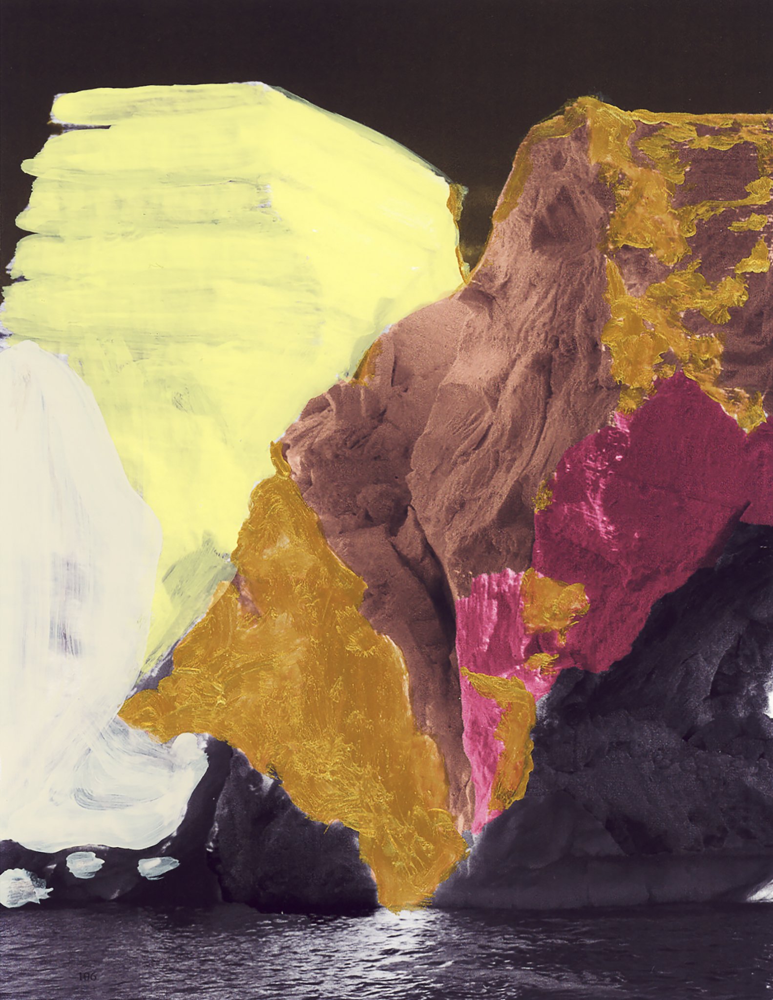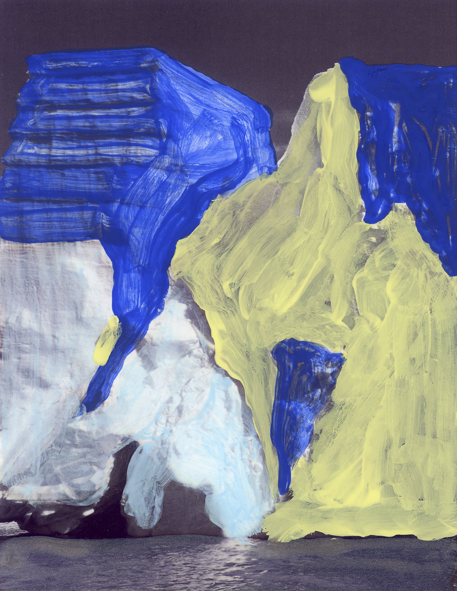 She reworks old photographs or her own photos of snowy landscapes or icebergs with paint, and then re-photographs them to create entirely new images—works that often hover somewhere between figuration and abstraction. This process allows her to interpret, personalize, and express her experience of nature as a kind of visual poetry.