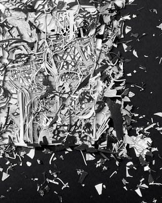 afbeeldingen: Kim Habers, Ceramic Drawing 2 (detail), 2025, porselein, onderglazuur, lijm op passe-partoutkarton, 41x37x4 cm.