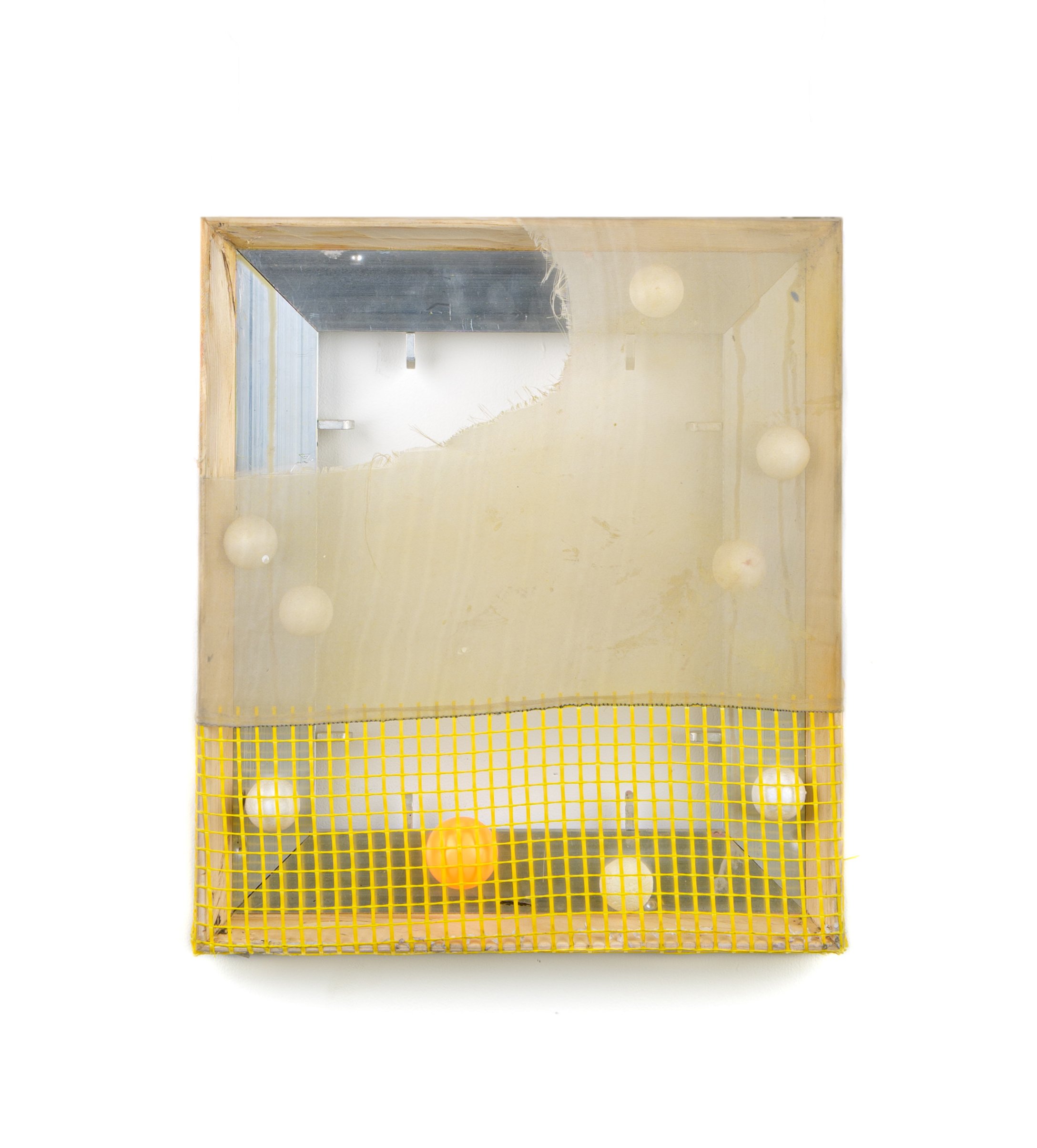 (rechts) Cas van Deurssen, piepschuim, plastic bal, gaas op canvas, 40 x 35 cm, 2023.