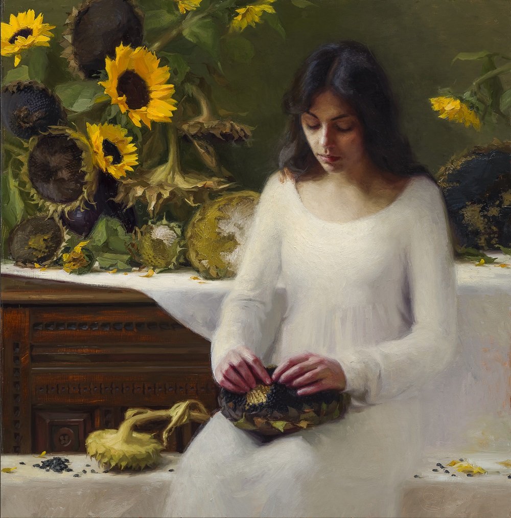 afbeelding: Svetlana Tartakovska - Verse Zonnebloempitten (2024), 97x96cm, olie op masonite, foto JAV-studio's Galerie Autrevue.
