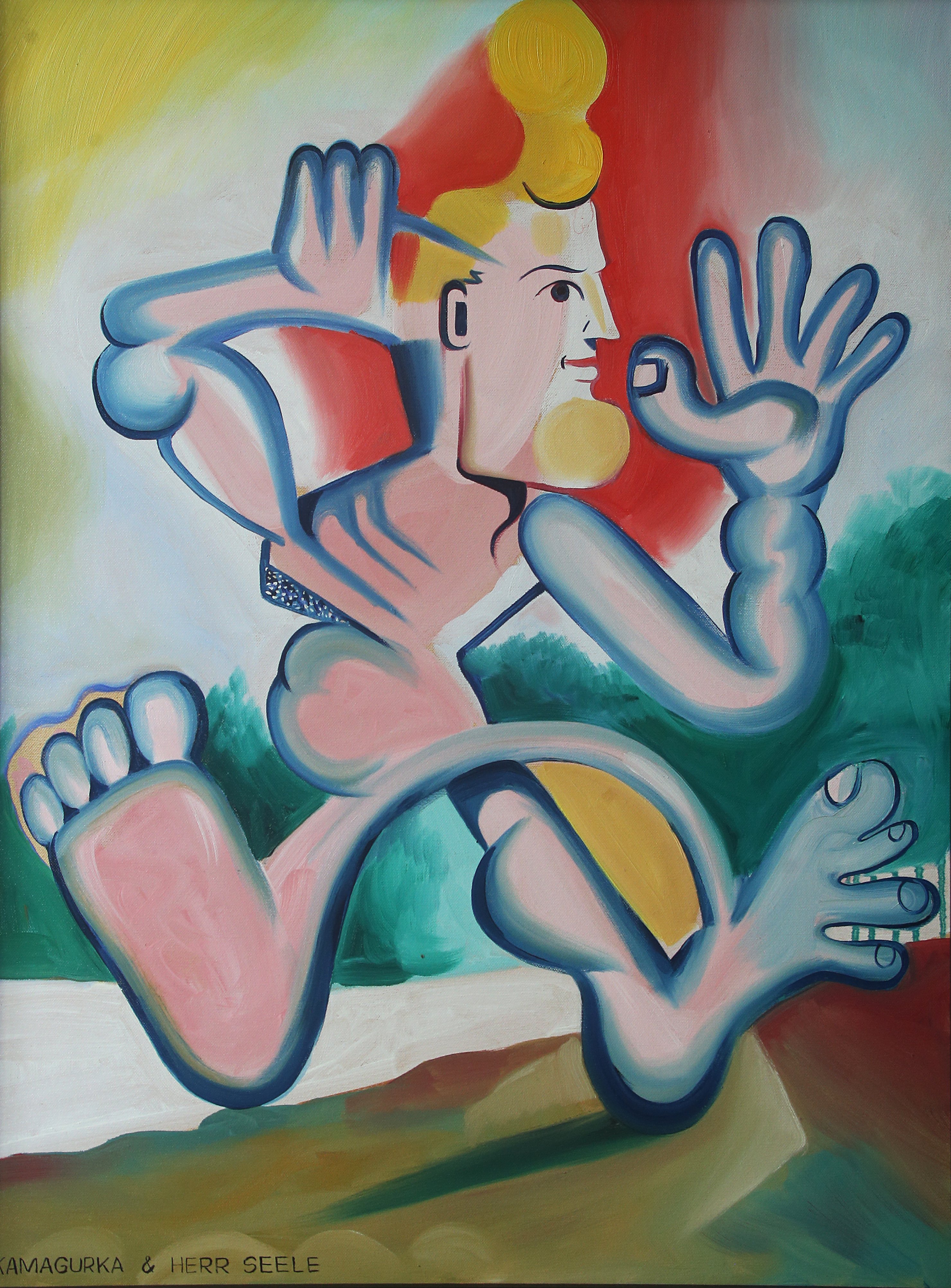 afbeelding: Kamagurka en Herr Seele - De dagdromende wandelaar (2023) olieverf op doek.